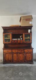Mobile solido e capiente, composto da base con ante e cassetti e alzata con vetrinette laterali in vetro lavorato e piccoli cassetti centrali.