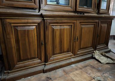 Vendo elegante mobile a doppio corpo (credenza e vetrina) in legno di noce di alta qualità, ideale per arredare con prestigio un salone, una sala da pranzo o uno studio professionale. Il mobile si distingue per la solidità costruttiva e la pulizia delle linee, ispirate allo stile classico italiano. Caratteristiche Principali: Struttura: Divisibile in due parti (base e alzata) per agevolare il trasporto. Parte Superiore: Vetrina a 4 ante con ripiani interni in vetro, perfetta per esporre servizi di piatti, cristalli o collezioni. Fianchi vetrati per una maggiore luminosità interna. Parte Inferiore: Base chiusa con ante a pannelli diamantati, offre un ampio spazio contenitivo Dettagli: Cornici modanate, ferramenta brunita originale e finitura in noce con venature a vista. Dimensioni: Larghezza: 225 cm Altezza: 225 cm Profondità: 50 cm NECESSITA SISTEMARE ANTE ED ALCUNI ELEMENTI CAUSA UMIDITÀ