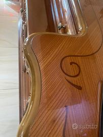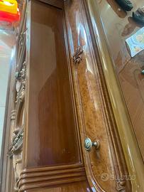 Vendo elegante credenza con vetrina abbinata in legno massello, stile classico, finemente lavorata con intagli decorativi e finitura lucida color noce/ciliegio.