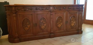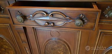 Vendo Arredo Vintage come da Descrizione (Vetrina, Credenza, Tavolo completo di 6 Sedie), scolpito in legno. Misure: Vetrina (L 160 x H230 x P46) Credenza (L 255 x H100 x P51) Tavolo (L165 x H79 x P106) Sedie (H100).