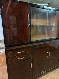 Vendo mobile credenza vintage originale, risalente indicativamente agli anni ’40/’50, finitura scura lucida, decorazioni chiare e vetri molato con motivi floreali