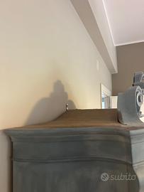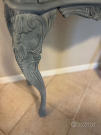 Elegante credenza/vetrinetta in stile classico, ispirata al Luigi XV (Rococò), ideale per soggiorno o sala da pranzo. Il mobile è stato completamente riverniciato circa 7 anni fa, mantenuto con cura e in ottime condizioni. Caratteristiche: •Struttura: legno massello (solido e durevole) •Finitura: verniciatura effetto opaco color grigio polvere/ carta da zucchero (artigianale) •Ante: vetro trasparente sagomato •Ripiani interni: vetro •Gambe: in legno massello, curvate a cabriole con piedi a zoccolo (tipici dello stile Luigi XV) •Decorazioni: dettagli scolpiti nella parte superiore e frontale •Cassetto inferiore: in legno con maniglia •Chiusura: con serratura Dimensioni: •Altezza: 200 cm •Larghezza: 90 cm •Profondità: 45 cm Condizioni: Ottime condizioni generali, con lievi segni del tempo. Struttura stabile. Nota: La credenza viene venduta vuota, senza bicchieri o oggetti decorativi. Mobile composto da due pezzi separabili, comodo per trasporto e movimentazione.