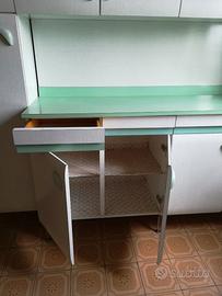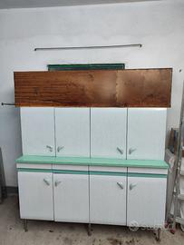 Simpatica credenza vintage in formica, doppio corpo con colonna, in buone condizioni. Maniglia rotta come da foto.