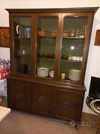 Credenza con relativa vetrina, vintage anni 70, 3 ante, colore legno scuro, molto capiente. Il mobile si compone di 2 corpi sovrapposti aventi le seguenti misure: altezza totale 203 cm, larghezza 151cm, profondità del mobile sottostante 46 cm, profondità della vetrina 36 cm Vendo
