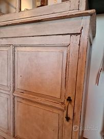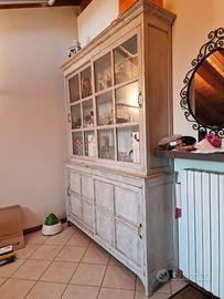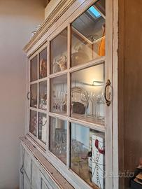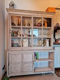 Credenza d'inizio XX secolo, a doppia anta scorrevole nella parte inferiore con due ripiani adatti per contenere stoviglie, piatti, scorte alimentari, etc...mentre nella parte superiore ampia e luminosa vetrina anch'essa con apertura scorrevole e 3 ripiani perfetti per esporre oggetti come libri, ceramiche, bicchieri e bottiglie.