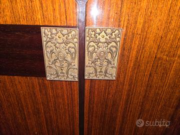 Vendo credenza vintage/modernariato con specchiera, finitura lucida, con ante e cassetti e bellissimi dettagli decorativi in metallo (stile ottone).