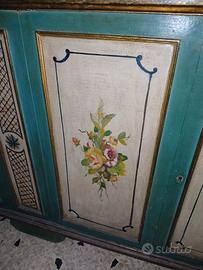 Vendesi splendida credenza in legno, finemente decorata e dipinta a mano. Il mobile presenta una struttura color verde salvia con quattro ante impreziosite da raffinati bouquet floreali su fondo chiaro, ideali per arredare ambienti in stile rustico, provenzale o classico.