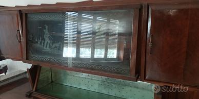 come da titolo vendo credenza vintage, è composta da due parti componibili cosi composta: nella parte superiore due sportelli laterali in legno massello lavorato a spina di pesce , vetrina ad apertura scorrevole sovrapposta, con disegno che rappresenta la caccia inciso con tecnica dell'epoca, e sottostante anglo bar a specchio verde con stelline incise , mentre nella parte inferiore è composta da 4 cassetti e 4 sportelli in legno massello lavorato a spina di pesce. il tutto in buono stato e funzionante come si vede dalle foto, unica cosa da sistemare, sono le tavolette che fungono da gambe posteriori che sono cedevoli. per info chiamare il 3515014004 anche whatsApp vendo prezzo di realizzo fate un offerta e ci accordiamo. preferirei ritiro di persona, ma posso anche spedire in tutta Italia isole comprese, naturalmente imballaggio e trasporto che è da calcolare in base alla destinazione, sono a carico dell'acquirente. in caso di spedizione onde evitare problemi di ogni genere, l'imballaggio e la spedizione verrà effettuata solo dopo che viene fatto il bonifico sul iban e la cifra pattuita sarà accreditata.