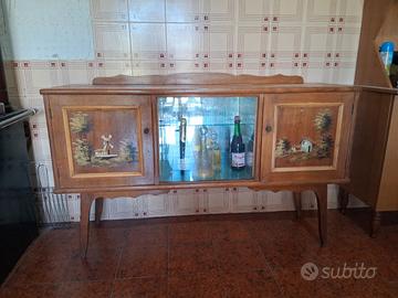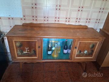 Vendo elegante credenza vintage in legno stile arte povera, con decorazioni dipinte sulle ante laterali e vetrina centrale con ripiani interni. Mobile solido e capiente, ideale per soggiorno, sala da pranzo o cucina. Perfetto anche come complemento d’arredo vintage o da restaurare in stile shabby chic. La parte centrale con vetro è ideale per esporre bottiglie, bicchieri o oggetti decorativi. Presenta normali segni di usura dovuti al tempo, ma nel complesso è in buone condizioni (come da foto). Misure: Lunghezza: 148 cm Altezza: 87 cm Caratteristiche: Materiale: legno 2 ante laterali decorate Vetrina centrale con ripiani Stile vintage/rustico