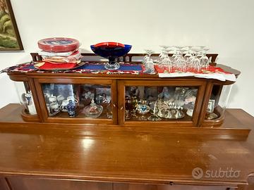 Vendo elegante credenza vintage anni ‘50 in radica di noce, composta da base con ante e alzata superiore con vetrinetta.
