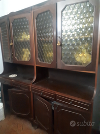 Credenza vintage anni 60 in legno con due ante superiori con vetri decorati, spazio centrale aperto, due cassetti e due ante chiuse vendo.