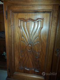 Particolare credenza bassa con profondità variabili. Tutto in legno.