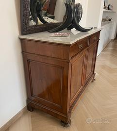 credenza antica a due ante e due cassetti, in legno di noce e risalente alla fine del XIX secolo. Presenta un piano in marmo e montanti scantonati, tipici degli stili Umbertino o Luigi Filippo.