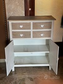 Graziosa credenzina in stile shabby chic con struttura bianca e frontali effetto legno naturale.