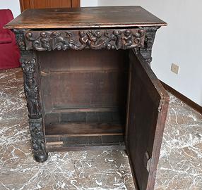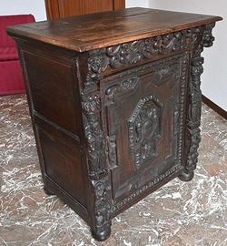 Credenzino in lego (forse noce) scolpito a tinta scura, con sportello centrale ed un cassetto nella fascia superiore. Il cassetto è scolpito con putti che cavalcano animali marini fantastici e con sirene. Le parti anteriori laterali che incorniciano lo sportello riportano teste di leone, cavalieri e cesti di frutta. Lo sportello invece, è scolpito con disegni geometrici, elementi botanici ed uno stemma vuoto. I piedi, sia anteriori, sia posteriori, sono tondi. Il piano superiore è rettangolare e pitto, con una semplice modanatura sul bordo.