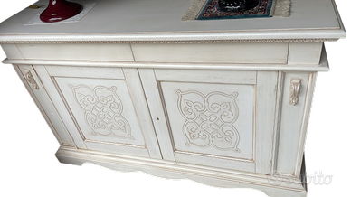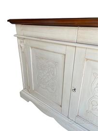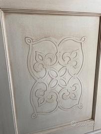 Finitura in foto decapè laccato bianco invecchiato con decoro a rilievo e piano Bassano. Possibilità di avere anta senza decoro, senza capitelli laterali e personalizzabile in qualsiasi finitura.