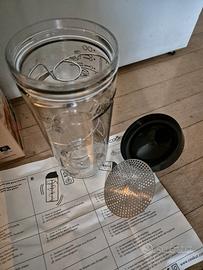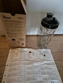 Shaker con bicchiere in vetro su cui sono riportate tutte le indicazioni per preparare crepes e pancake senza bisogno della bilancia, né di altre stoviglie. Completo di filtro e tappo per versare il composto direttamente in padella. Come nuovo, nella sua confezione originale