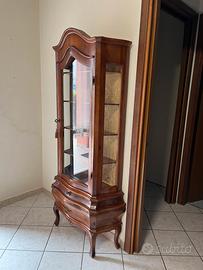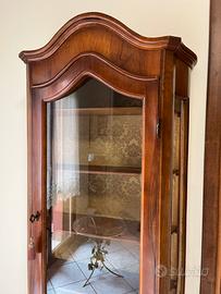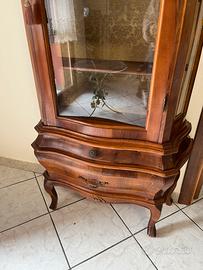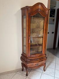 Cristalliera antica realizzata in legno di noce, tipicamente databile alla prima metà del XX secolo. - design raffinato - anta a vetro frontale e laterale - all’interno presenta più ripiani - stile Barocco riconoscibile dalle caratteristiche della parte superiore curva, delle gambe e i fianchi bombati - in basso é dotata di un cassetto con maniglie in metallo lavorato - misure: altezza 179 cm, profondità 27cm, larghezza 53 cm