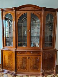 mobile in stile classico di legno pregiato con ante e cassetto, sormontato da una vetrina superiore con ante in cristallo.