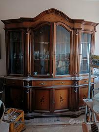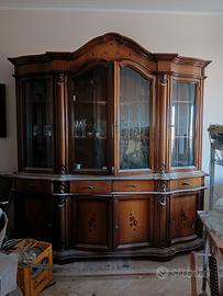 Vendo splendida cristalliera in stile classico degli anni '80, in legno massello con intarsi floreali e vetrine in cristallo. Composta da una parte superiore con 4 ante in vetro (centrali bombate) e ripiani interni ideali per esporre cristalli, porcellane o collezioni, e una base con 4 ampi cassetti e 6 ante in legno, perfetta per contenere tovaglie, stoviglie e oggettistica.