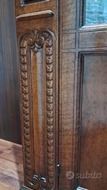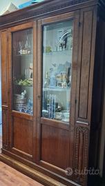 Cristalliera elegante in stile arte povera, realizzata in legno massello con raffinati intarsi. Parte superiore con ante in vetro per esporre servizi o oggetti decorativi, parte inferiore con ante in legno per riporre utensili. Solida, ben tenuta e ideale per arredare con un tocco classico e caldo.