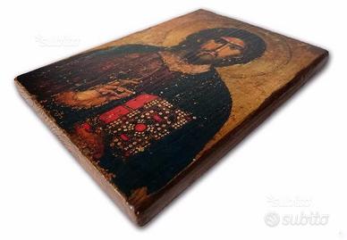 Icona antichizzata ed eseguita interamente a mano su legno. Misura è di 21 × 14,5 cm. I prodotti utilizzati per l'esecuzione sono completamente naturali. Infatti vengono adoperate esclusivamente le cere d'api, colori naturali, essenza di trementina vegetale... Si precisa che sono disponibili alla vendita altre numerose icone di varia misura e di soggetti diversi sempre di natura religiosa, anche su ordinazione. Se interessati all'acquisto sono contattabile al seguente mostra numero o rispondi.