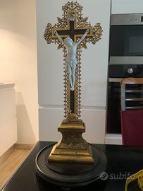 Oggetto religioso primi ‘900, con croce decorata in filigrana e figura di Cristo in resina. La campana di vetro lo protegge ed è ideale da esporre. Altezza della campana 55 cm e diametro 22 cm. Buone condizioni generali con normali segni del tempo.