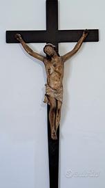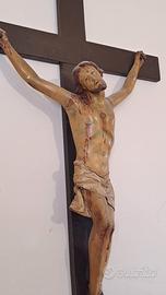 Splendido crocifisso dipinto a mano in cartapesta su croce in legno. Presumibilmente alla fine del XVII secolo o ai primi del XIX secolo. Dettagli realistici. Dimensione croce 115 cm Dimensione figura 60cm