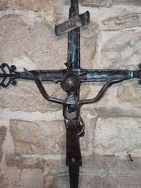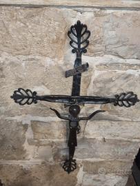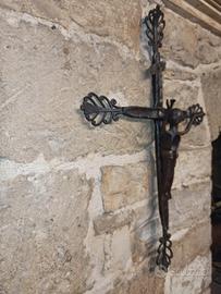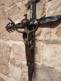 Crocifisso in ferro battuto, stilizzato, forgiato e lavorato interamente a mano, con materiali riciclati, per il corpo è stata usato un piccone.