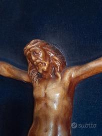 Scultura: Cristo in ceramica interamente rifinito a mano. L'anatomia è dettagliata, con particolare cura nel panneggio del perizoma e sfumature realistiche su costato e addome. Dettaglio suggestivo dei chiodi e del filo legati ai palmi e ai piedi.