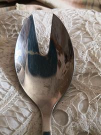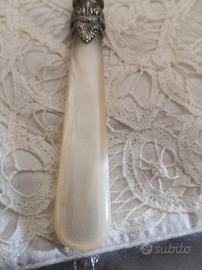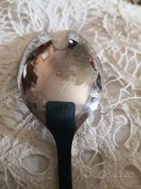 Grande cucchiaio antico in acciaio inox, con manico finemente decorato, potrebbe essere madreperla ed argento non certificato. In ottime condizioni come da foto