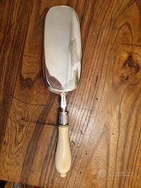 Cucchiaio raccogli briciole placcato argento inglese, manico in plastica (bachelite). Anni prime decadi 1900. ossibi su lato posteriore