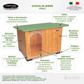 Poggiano su piedoni in materiale plastico che proteggono dall’umidità tutta la struttura. L’ingresso è dotato di bordature protettive in alluminio anti morso e scheggiature del legno.Il Tetto è smontabile; ciò permette una facile pulizia interna. La sua copertura è realizzata in uno speciale materiale impermeabilizzante ed isolante, rivestito con scaglie di pietra d’ardesia colorata verde prato.