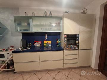 cucina febal in inclusi elettrodomestici. il lato dove si trovano il frigo e il forno è lungo 3 metri. il lato opposto con piano cottura ( 5 fuochi) e lavello 2,70. la profondità della base è di 60, quella del pensili 38