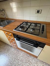 Cucina da 2,80 m color giallo sidro e legno, completa di fornello quattro fuochi da 60 cm, forno da 60 cm e frigorifero con congelatore a tre cassetti(tutti funzionanti)molto robusta in tutte le sue parti.Top color legno lievemente consumato nel bordo esterno. Speculare essa vi sono due basi da 90 cm con ante da 45 cm ed un bellissimo top da 2,90 m (usato come banco snack o piano lavoro)