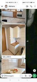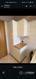 Cucina in buone condizioni 330x60x240 bianca con top, cassettiera e vetrinetta color noce. Doppio lavello con sgocciolatoio in materiale composito. Completa di frigorifero e forno funzionante. A lato colonna dispensa profondità 60 cm e mobile porta TV. Compreso tavolo e 4 sedie.