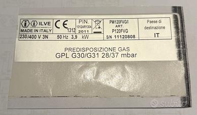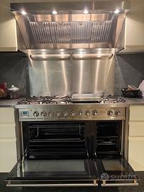 Cucina gas ILVE 7 fuochi con piastra e griglia. Due forni: il maggiore a gas e il piccolo elettrico. Lunghezza 120 cm X 58 cm larghezza. Con cappa.