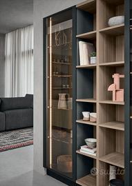 Le vetrine Teca con ante in alluminio e vetro fumè con l'elemento a giorno in finitura Noce .
