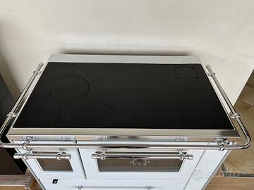 Cucina a legna tradizionale in acciaio smaltato con finiture in inox. Oltre a cucinare, scalda l’ambiente per irraggiamento. È composta da un piano cottura in acciaio e un forno smaltato nero con portina in vetro ceramico dotata di termometro. Nella parte bassa è stato situato un pratico cassettone portaoggetti. È predisposta per l'uscita dei fumi superiore, laterale e posteriore.