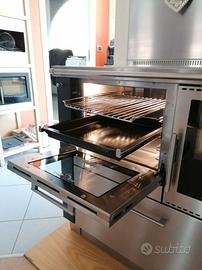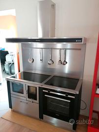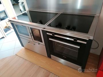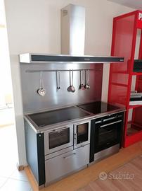 Cucina a legna combinata Pertinger - misure 155 x60 cm altezza regolabile da 85-91 cm . Piano spessore 40 mm , altezza alzatina posteriore 40 mm spessore 20 mm. Fianchi neri . Piastra cucina in acciaio a cerchio unico. Illuminazione nel forno . Prolungamento piano in acciaio con piano cottura in vetroceramica . e forno elettrico da 60 cm. Uscita fumi posteriore a tre posizionamenti o fianco laterale sinistro. Pannello posteriore in acciaio inox . con asta porta mestoli . Cappa Pertinger modello Line misure 155 profondità 50 cm . Tutta in acciaio con fascia nera . Camino centrale - Filtri estraibili - Potenza 850 m cubi ora.