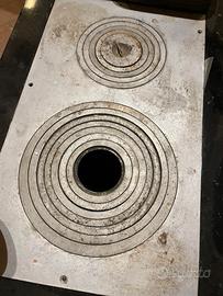 Struttura solida in metallo con piano superiore in ghisa dotato di due piastre removibili di diverse dimensioni, perfette per regolare la potenza del calore e cucinare direttamente sul fuoco. Presente forno laterale e sportelli frontali per gestione combustione e pulizia cenere.