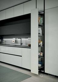 vani contenitivi che ottimizzano la gestione degli spazi, come le colonne estraibili che permettono di sfruttare al massimo ogni centimetro, per una cucina sempre ordinata.