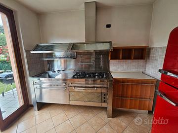 Cucina Varenna in acciaio inox con 2 mobili contenitori in legno. Cassettone sotto lavello con 4 contenito per differenziata. 1 forno elettrico sia normale che ventilato. Piano cottura con 4 fuochi a gas ed uno elettrico centrale. Cappa aspirante + scolapiatti ed accessori vari. I 2 mobili in legno hanno 4 capienti cassettoni.