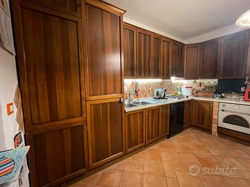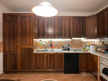 Grande cucina ad angolo componibile. Color noce, top finto marmo. Misure 400x228 (238 con il muretto), ma disponibili alcuni elementi aggiuntivi (mobile da 45 e mobile conclusivo ad angolo da 40 cm non in foto). Altezza pensili 95 cm più cappello superiore. Colonna frigo e dispensa alte 235 cm più cappello superiore. La cappa è un pensile contenitore. I tre muretti sono di cartongesso. Disponibile un quarto, non in foto. Elettrodomestici compresi, tranne la lavastoviglie, che non è funzionante.