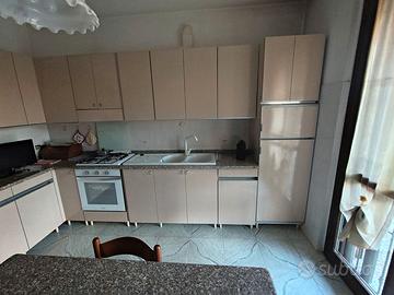 Elettrodomestici (funzionanti): Frigorifero a colonna, forno elettrico bianco, piano cottura 4 fuochi a gas e lavastoviglie da incasso e cappa.