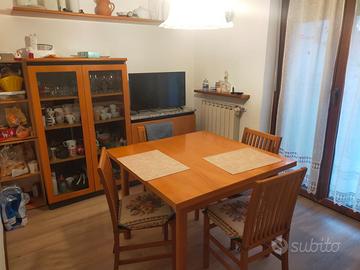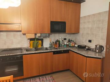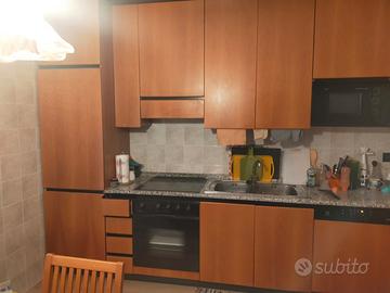 Cucina ad angolo (356x164 cm, profondità 60 cm) con piano in marmo, con mobile frigo e pensili, completa di lavandino a doppia vasca, tavolo quadrato 100x100 cm, raddoppiabile (100x200), vetrina e mobile porta tv (90+90 cm, profondità 50 cm) e mensola (180 cm). Elettrodomestici disponibili se graditi.