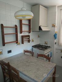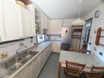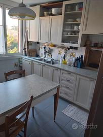 Vendo cucina con portelle in legno bianco con vena visibile. Lunghezza cm 348, angolo 120. Altezza cm 240. Ottime condizioni. Frigo non disponibile, ma indipendente.