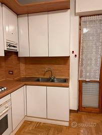Cucina ad angolo dotata di elettrodomestici (frigo, forno, fornelli). Misure: - Mobiletto cucina: 135cm lunghezza, 60cm profondità, 233cm altezza1, 88cm altezza2 - Cucina: 3m lunghezza1, 150cm lunghezza2, 238cm altezza PREZZO TRATTABILE