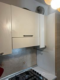 Vendo cucina ad angolo con pensili. No elettrodomestici. Smontaggio a carico dell’acquirente. Vendo lavandino con rubinetto pieghevole sotto-finestra. Vendo cappa ma da sistemare il filtro. La colonna del frigo é staccabile. Prezzo trattabile.