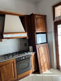 Cucina con sportelli e cassetti in legno e ripiani interni in impiallacciato. Lavandino e piano cottura in buone condizioni. Altezza 240 cm. Lunghezza 335 cm. Profondità 60 cm; profondità all’angolo 80 cm. Frigorifero non compreso. Prezzo 700 euro trattabili.